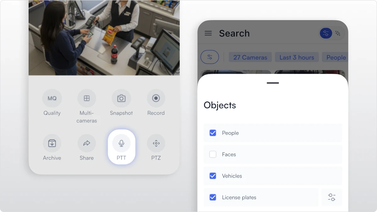 Push to Talk enables real-time two-way audio directly from the mobile app. With a single tap, users can speak through integrated or external speakers to deter suspicious behavior, communicate with staff, or de-escalate a situation without needing to be on-site. For retail, a loss prevention manager can intervene verbally the moment an alert fires. For manufacturing, supervisors can reach workers in specific zones instantly, without relying on radio systems.