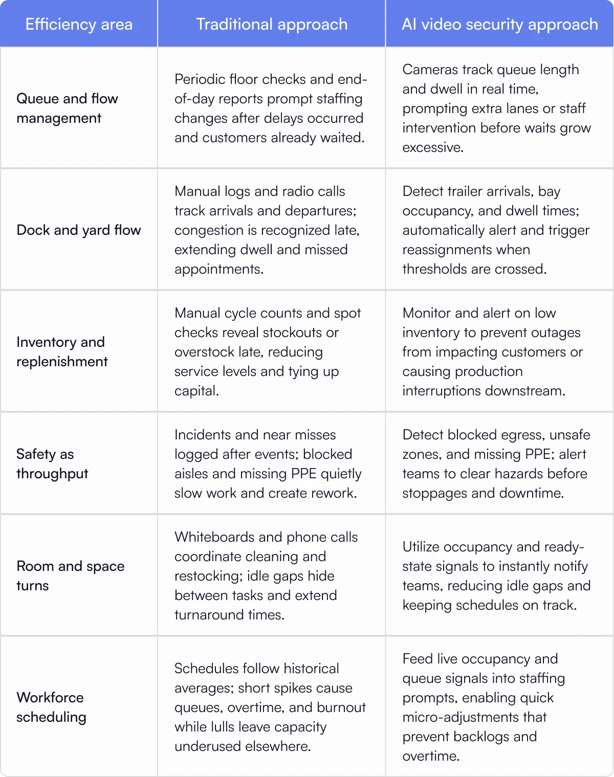 Here’s how traditional operations compare to AI video security-driven operations across key efficiency areas: