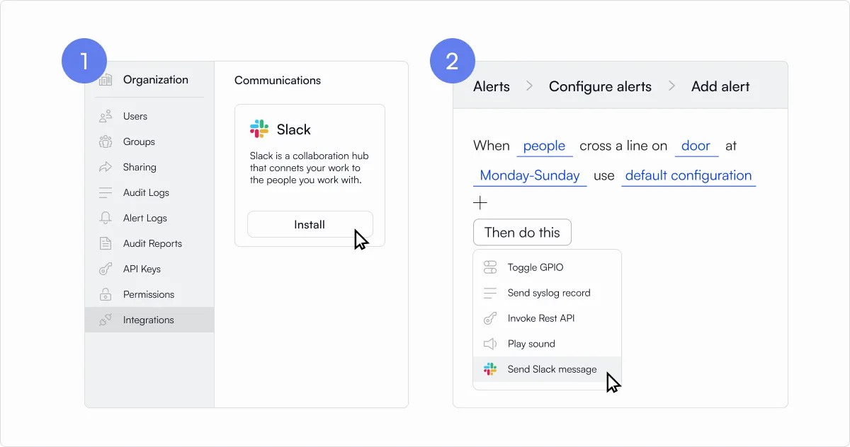 To enable the Slack integration, go to Organization Settings > Integrations and connect Slack. Once configured, users can include Slack notifications as an automated action when creating alerts. This is in addition to notifying specific individuals, triggering a speaker, pushing an API or GPIO command, and more.